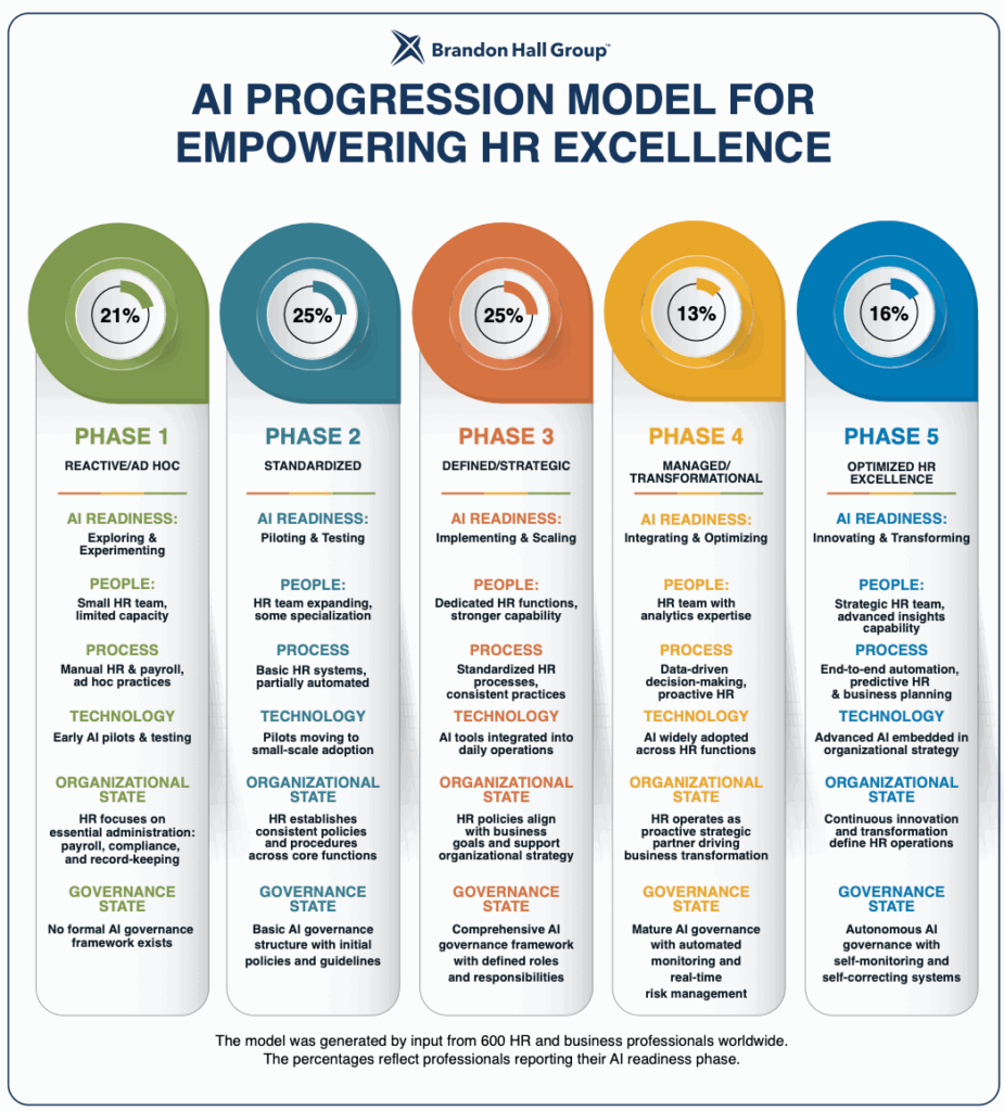 Every organization is at a different point in their AI journey — and that’s exactly as it should be. Brandon Hall Group’s groundbreaking new research with 600 HR professionals worldwide reveals five distinct phases of AI progression in HR, providing a clear framework to understand where you are today and how to advance strategically toward your goals.
